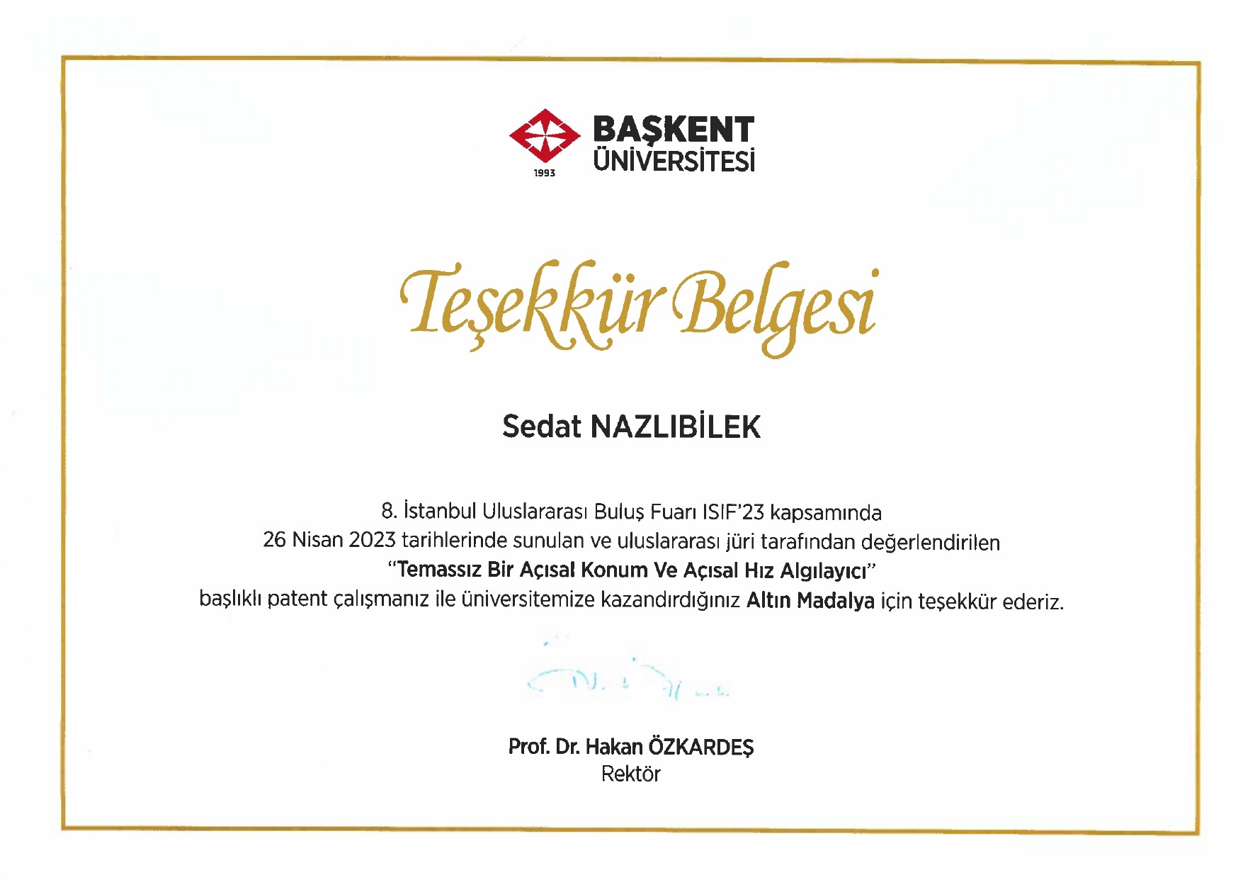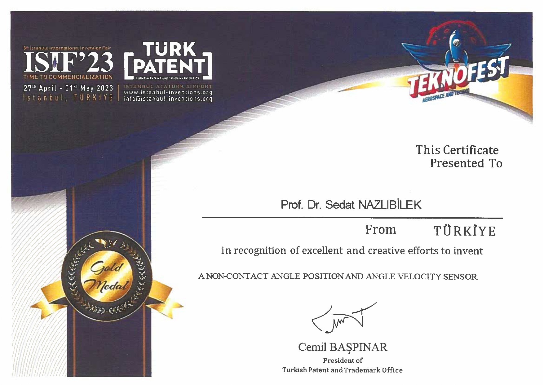 Fakültemiz Elektrik-Elektronik Mühendisliği Bölümü Öğretim Üyesi Prof. Dr. Sedat Nazlıbilek, "Temassız Bir Açısal Konum ve Açısal Hız Algılayıcı" başlıklı buluşu ile patent belgesi ve altın madalya almaya hak kazanmıştır. Öğretim Üyemizi tebrik ederiz.