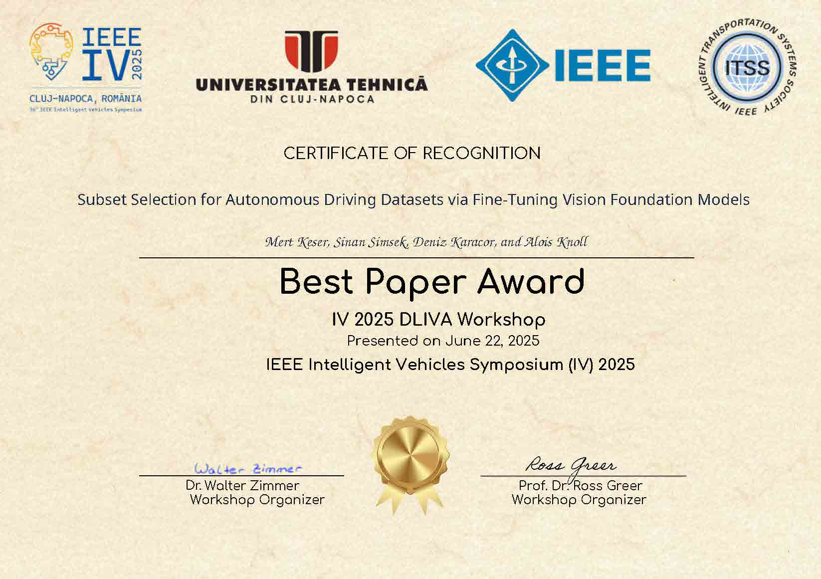 Dr. Deniz Karaçor, a faculty member of our Electrical and Electronics Engineering Department, received the "Best Paper" award for the study titled "Subset Selection for Autonomous Driving Datasets via Fine-Tuning Vision Foundation Models", presented at the ‘IEEE Intelligent Vehicles Symposium (IV) 2025 DLIVA Workshop’ held in Cluj-Napoca, Romania, between June 22–25, 2025. We congratulate our professor and wish continued success.